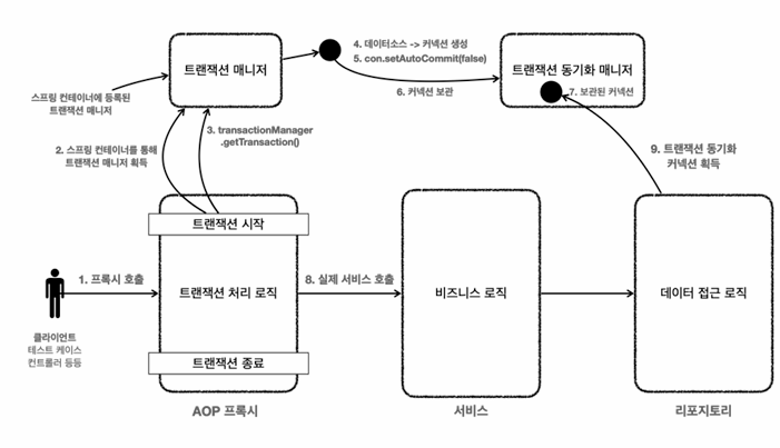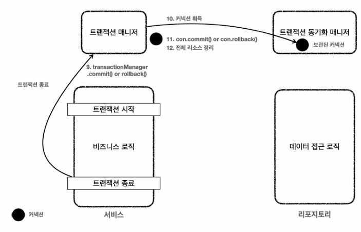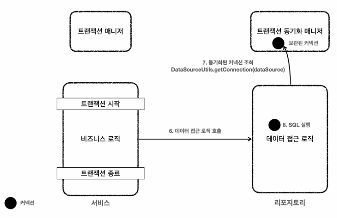 - 트랜잭션 매너지가 데이터소스를 통해 커넥션을 만들면 트랜잭션 동기화 매니저에 보관하고, 레포지토리가 이 트랜잭션 동기화 매니저에 저장된 해당 커넥션을 가져다 쓰는 방식으로 동일한 커넥션을 유지하는 것.
