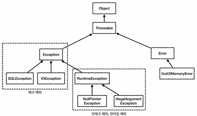 최상위 예외 객체인 Throwable을 상속받는 Exception과 Error 중에, 잡아야 하는 예외는 Exception 이다. Error는 잡으려고 하면 안되기 때문이다.
