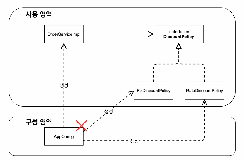 - 또한, 기존의 FixDiscountPolicy에서 할인 정책을 변경하기 위해 새로운 구현체인 RateDiscountPolicy를 넣어주는 것으로 코드를 변경함으로써 OCP도 위반하게 됨.