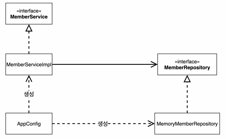 - AppConfig 클래스를 통해, 클래스에 필요한 구현체를 생성자를 통해 주입해준다(-> DI). 즉, 역할과 구현을 철저히 분리함으로써 DIP를 지키는 것.