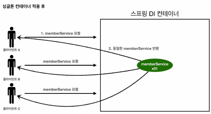 - 스프링 컨테이너는 싱글톤 패턴을 적용하지 않아도, 객체 인스턴스를 싱글톤으로 관리함.