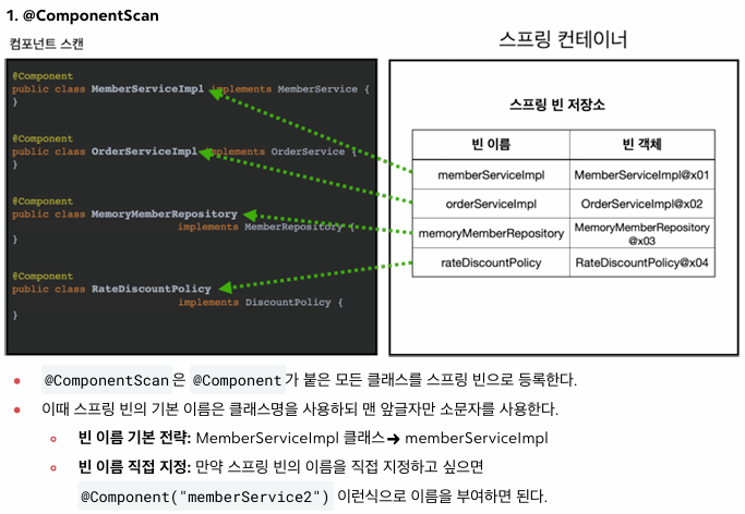 - 컴퍼넌트 스캔은 다음의 어노테이션에 대해 스캔 대상으로 삼는다. -> @Component, @Controller, @Service, @Repository, @Configuration