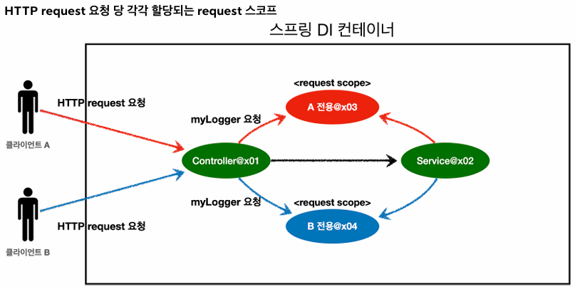 - ObjectProvider.getObject()를 호출하는 시점까지 request scope 빈의 생성을 지연할 수 있음.