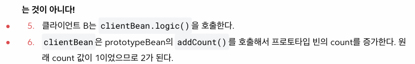 private final Prototypebean prototypebean; // 생성 시점에 주입돼서, 똑같은 프로토타입 빈이 계속 쓰임. ClientBean은 싱글톤이기 때문