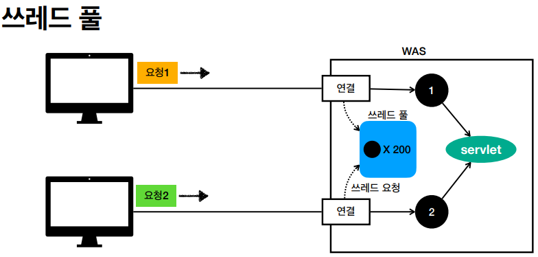 - 이를 해결하기 위해 WAS는 미리 생성된 쓰레드들을 유휴 상태로 유지하다가 요청이 들어오면 즉시 할당하여 처리하는 쓰레드 풀(톰캣의 기본 최대 쓰레드는 200로 설정) 구조를 사용한다.