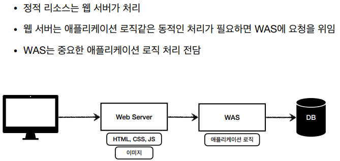 - 즉, 웹 서버는 정적 리소스, WAS는 애플리케이션 로직을 실행하는 서버