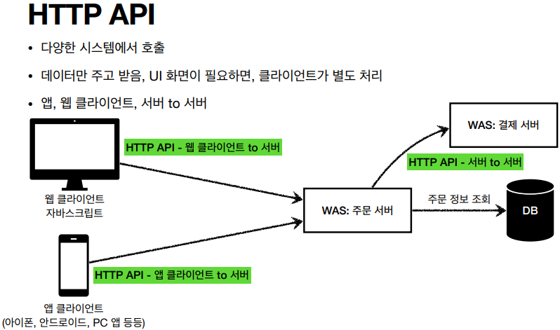 - HTTP API: HTML이 아닌 데이터(JSON 등)를 전달, 클라이언트가 화면 구성