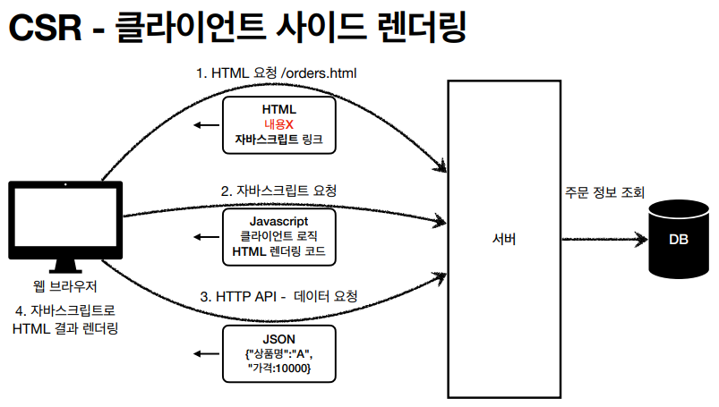- CSR (Client Side Rendering): 서버는 데이터만 전달하고, 클라이언트가 JS로 HTML 구성 - 주로 동적인 화면에 사용