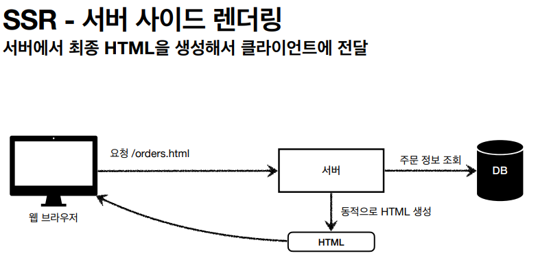 - SSR (Server Side Rendering): 서버에서 최종 HTML을 생성해 클라이언트에 전달 - 주로 정적인 화면에 사용