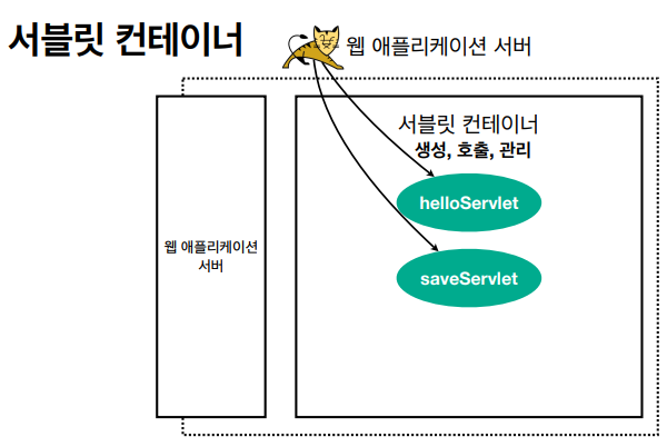 - 서블릿은 싱글톤으로 관리되고, 서블릿 객체 생성, 초기화, 호출, 종료하는 생명주기를 관리해줌.