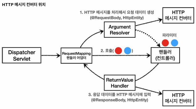 - 즉, ArgumentResolver나 ReturnValueHandler가 메시지 바디에 접근할 필요가 있을 때, 내부적으로 HttpMessageConverter를 사용